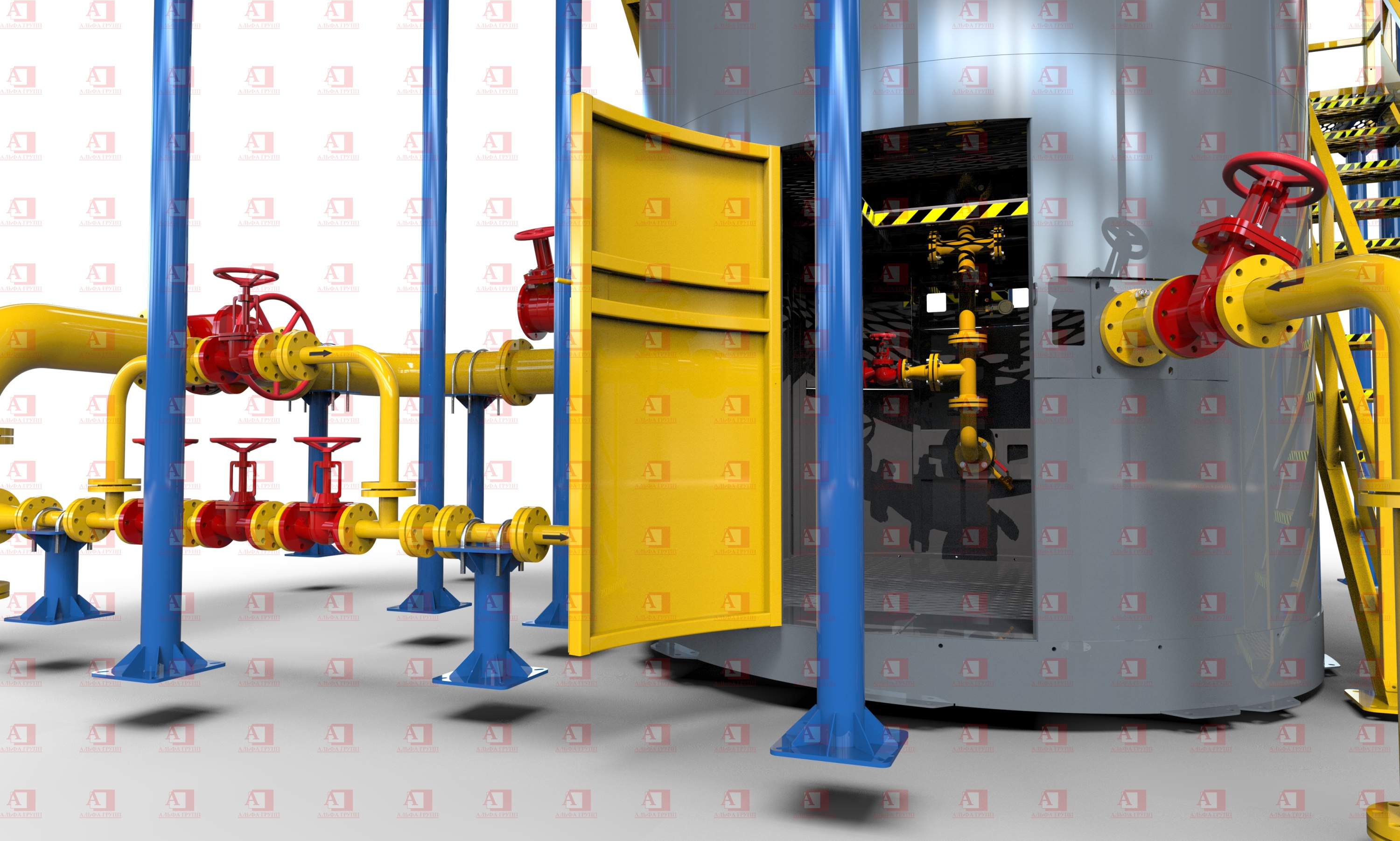 Места интенсивной работы с трипод усилены листами стали и швеллером. Люки и лазы размещены строго симметрично друг под другом для максимального использования высоты комплекса.